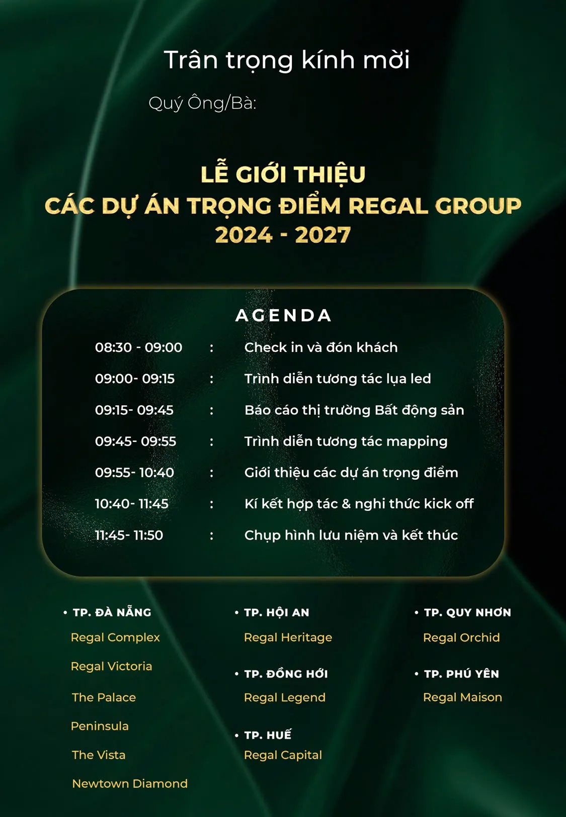Cũng trong khuôn khổ chương trình, chủ đầu tư sẽ giới thiệu đến khách hàng những dự án trọng điểm mà Regal Group sẽ triển khai trong giai đoạn 2024-2027. Một số dự án nổi bật như Regal Legend (Đồng Hới), Regal Capital (Huế), Regal Complex, Regal Victoria, dinh thự The Palace (Đà Nẵng), Regal Heritage (Hội An), Regal Orchid (Quy Nhơn), Regal Maison (Tuy Hòa).