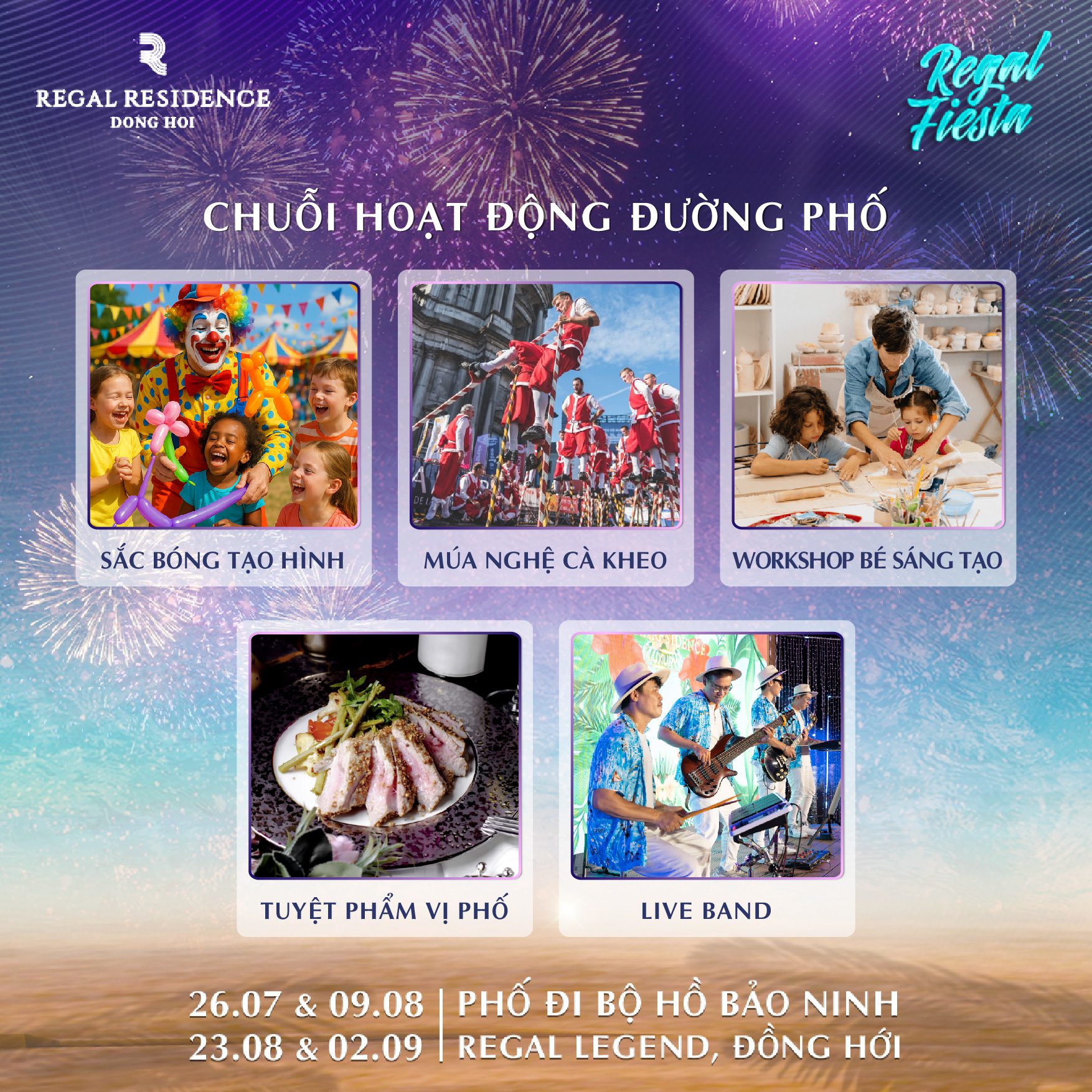 Không dừng lại ở những khoảnh khắc lãng mạn, Regal Legend còn thổi bùng năng lượng mùa hè với Regal Fiesta – lễ hội đường phố sôi động diễn ra vào các ngày 26/07, 09/08, 23/08 và 02/09/2025 tại phố đi bộ ven hồ Bảo Ninh.